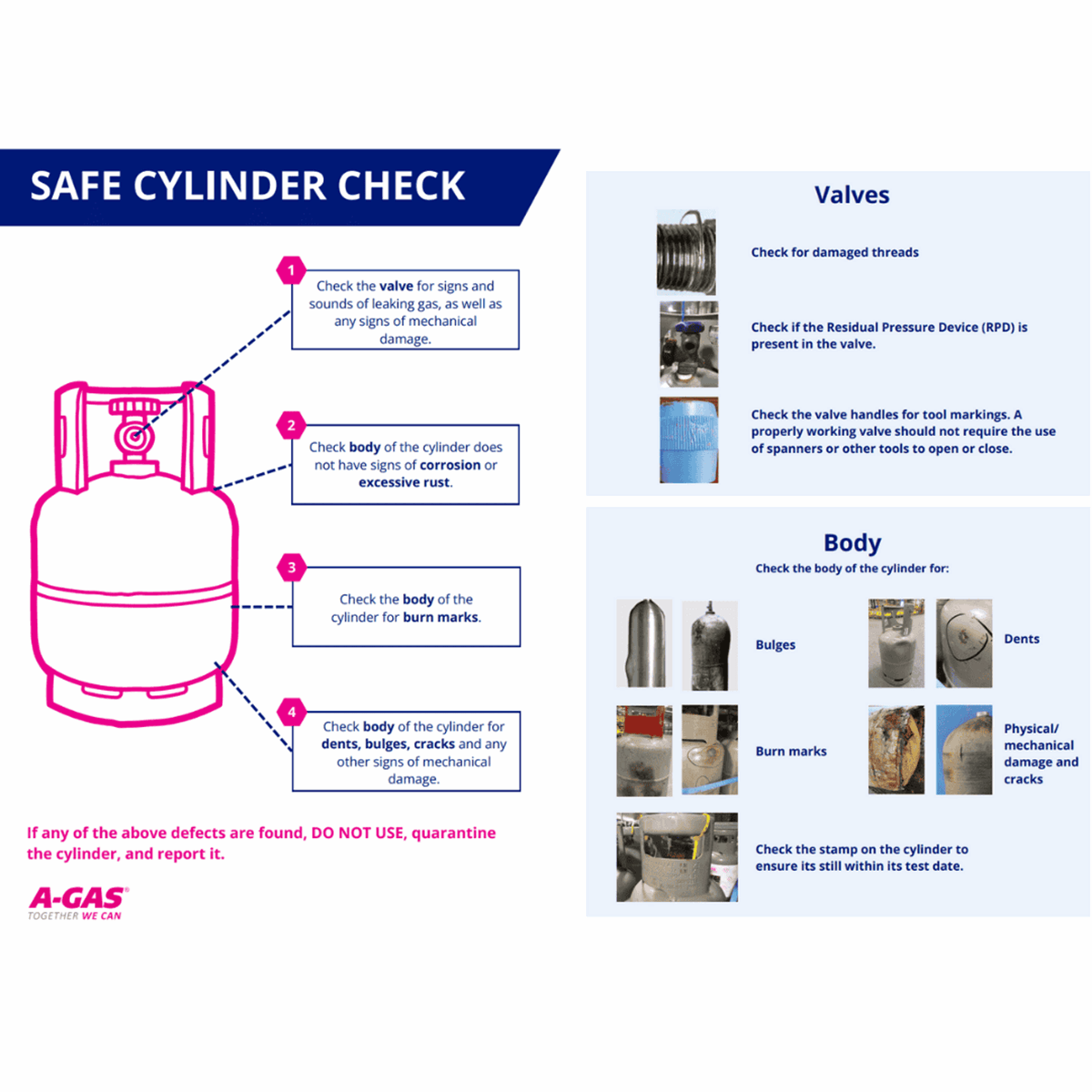 If you see any defects depicted in the Safe Cylinder Checklist, contact us or your A-Gas representative directly.